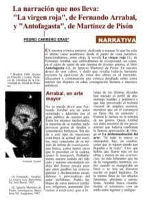 ARRABAL ESTRENA EN NUEVA YORK ‘LA VIRGEN ROJA‘. ALBERT MONTAGUT. Nueva York. 20 de noviembre de 1986. El polémico autor teatral español Fernando Arrabal (Melilla, 1932) está en Nueva York para montar la obra «La virgen roja» (La vierge rouge), cuyo estreno mundial se ha fijado para hoy en el pequeño teatro Intar, un centro de artes latinoamericano situado en la calle 42, en Manhattan. Dirige la obra, a pesar de que declara no ser demasiado partidario de montar sus propios trabajos y reconoce estar disfrutando muchísimo con el montaje. Simultáneamente al estreno de «The red madonna or a damsel for a gorilla», Arrabal ha pronunciado varias conferencias sobre su teatro y ha asistido a la reposición de una de sus mejores obras: «El arquitecto y el emperador de Asiria».